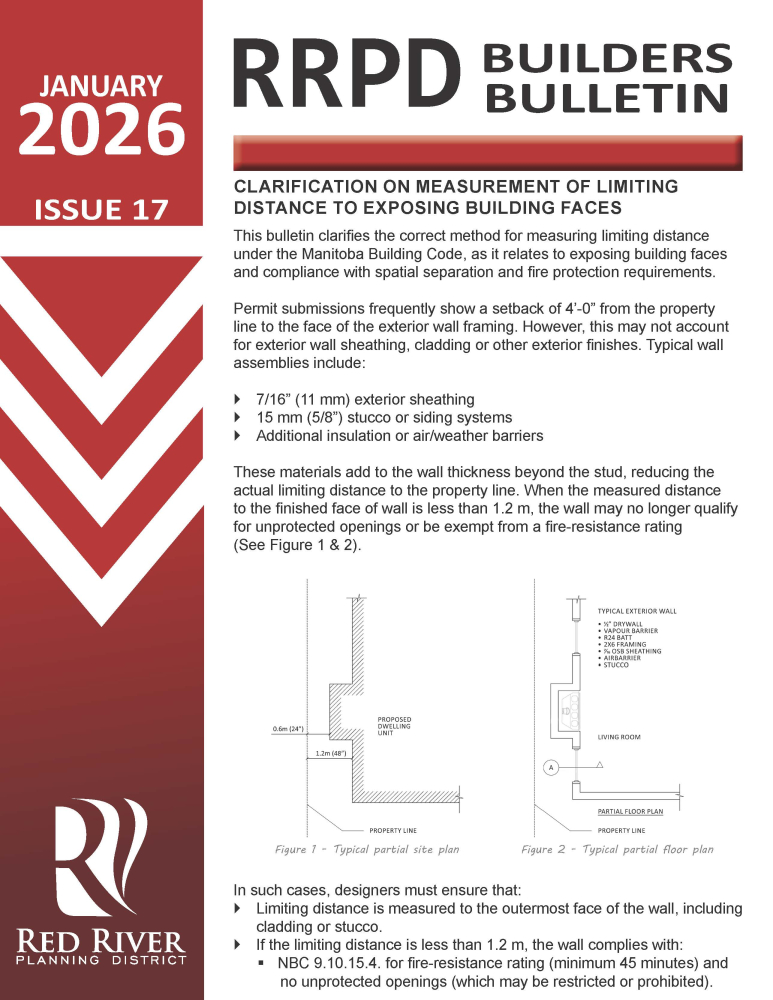 This bulletin clarifies the correct method for measuring limiting distance under the Manitoba Building Code, as it relates to exposing building faces and compliance with spatial separation and fire protection requirements.